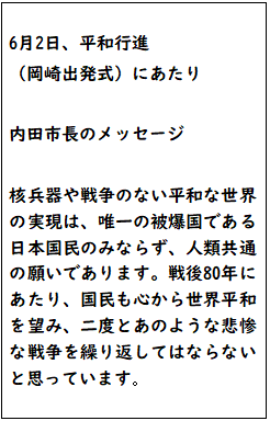 市は目的を「戦争を体験した世代が大変深くなってきた。岡崎でも空襲があったことを知らない世代が増えており、戦争の体験を風化させることなく、平和の尊さを将来にわたって語り継ぐため」とし